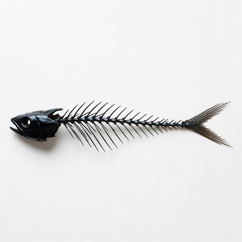 Black fish skeleton lies flat on a white surface, showing detailed bone structure and sharp spines. The focus is on the unique form of the fish.