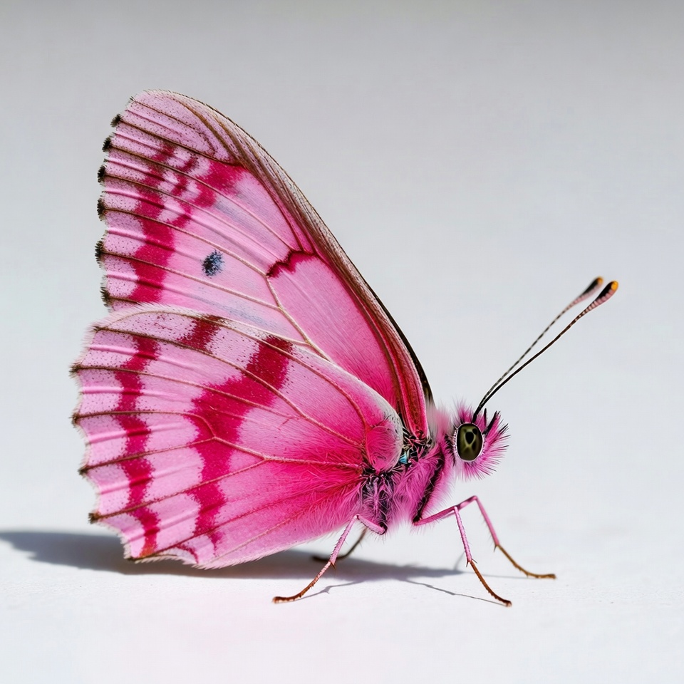 A bright pink butterfly with distinct patterns sits on a smooth surface, showing its wings and body clearly in a close-up view.