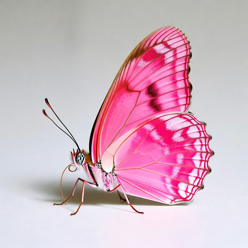 A bright pink butterfly stands on a flat surface, showcasing its detailed wings and delicate features in natural light.