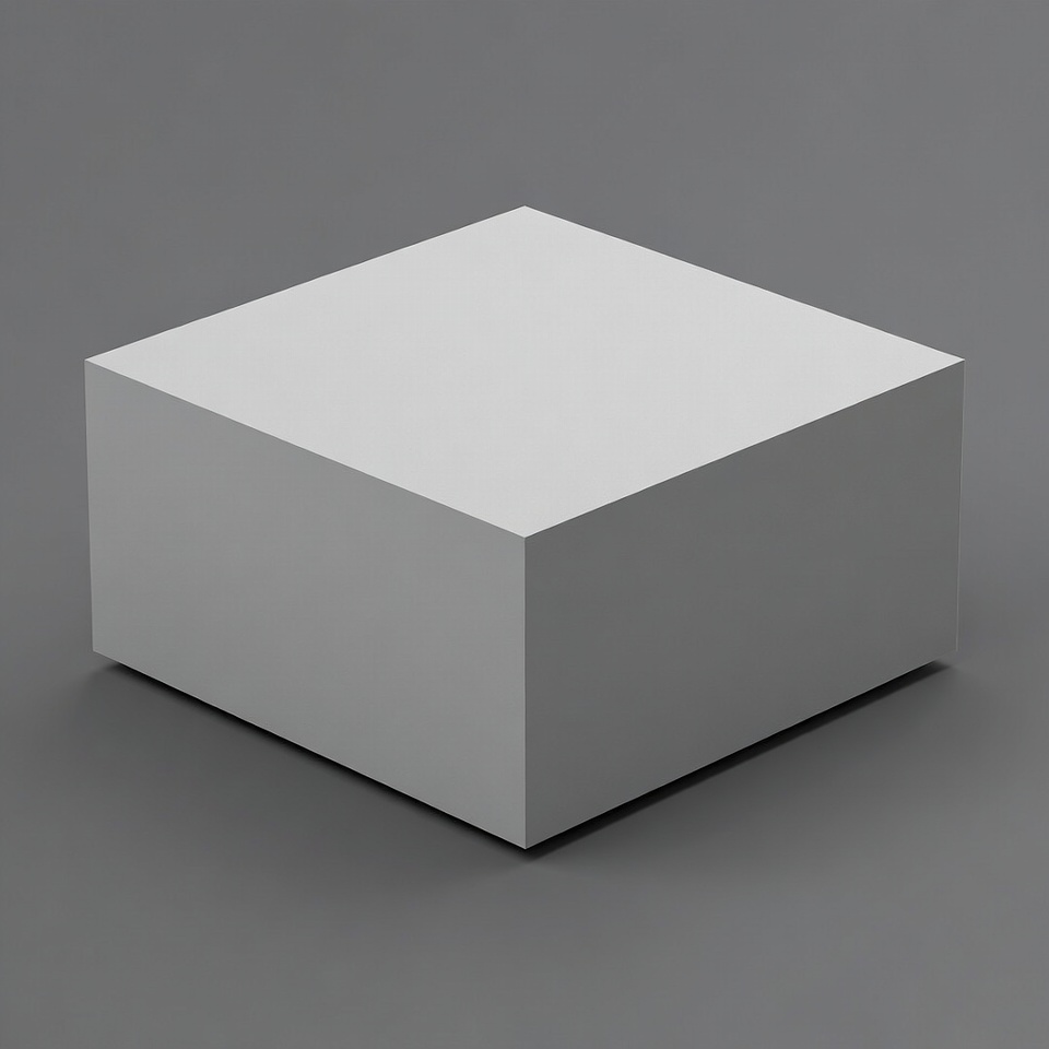 A solid white cube sits on a gray surface. The cube has sharp edges and a smooth finish, showcasing minimalism in design.