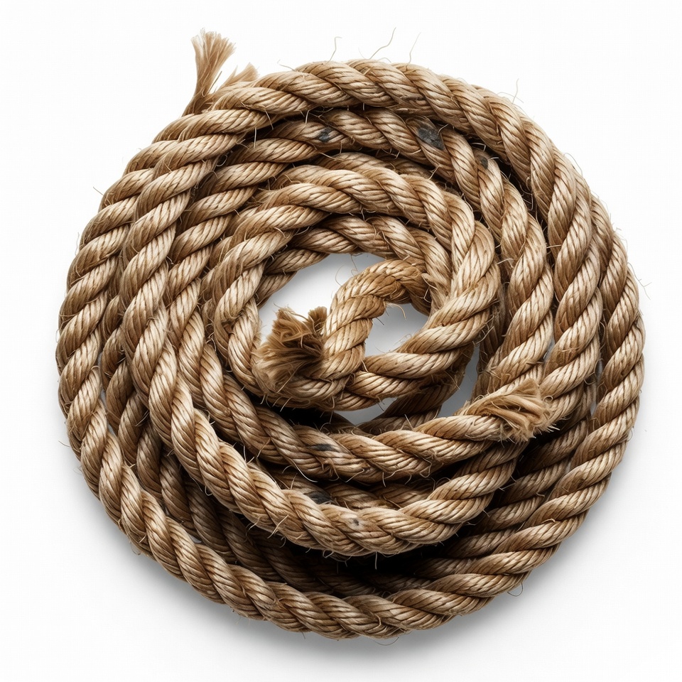 A coiled rope made of natural fibers is placed on a white background. Its texture and color are clearly visible in the setup.