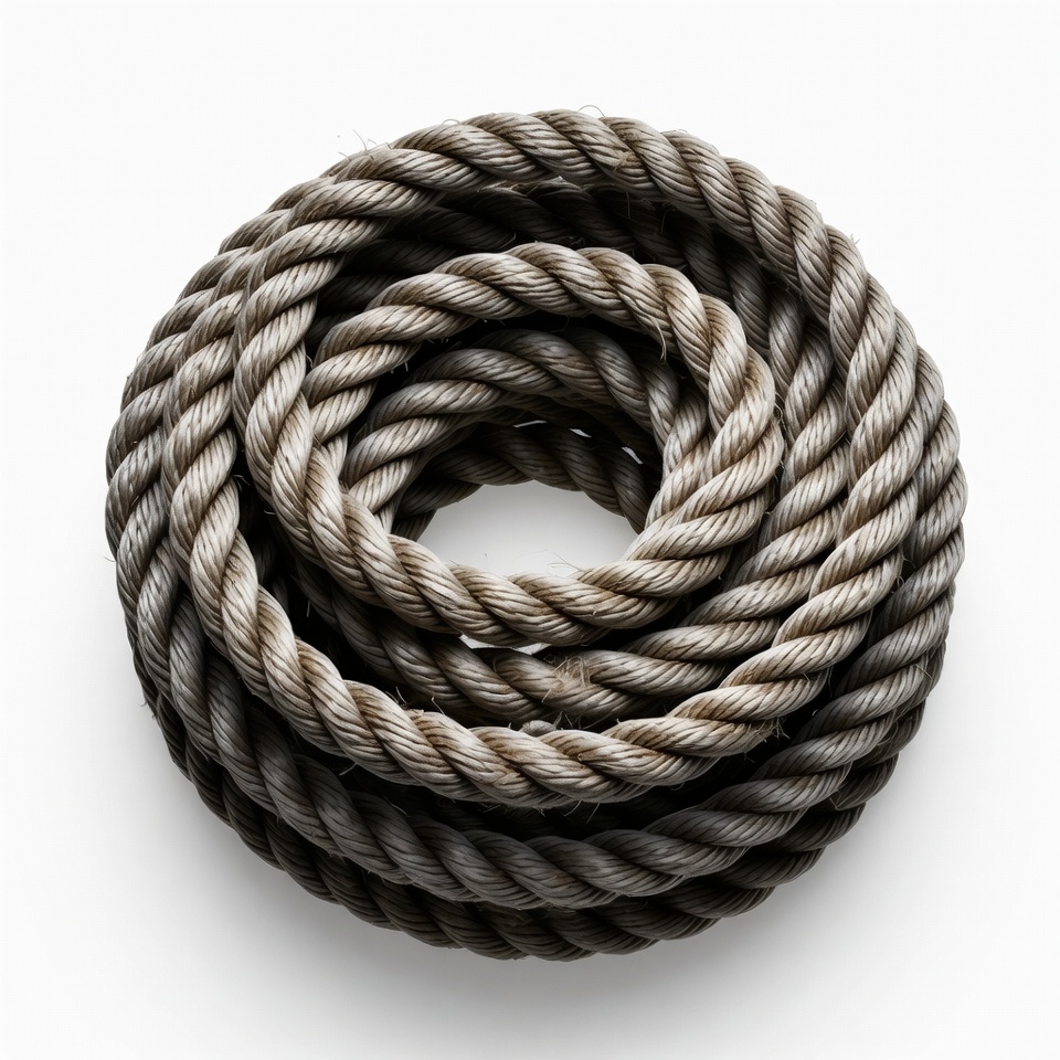 A thick rope is neatly coiled in a circular shape. It rests against a white background, highlighting its texture and form.