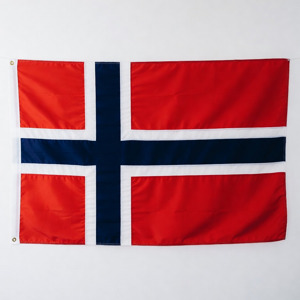 A Norwegian flag hangs flat against a wall. The flag features red, blue, and white colors arranged in a cross pattern.