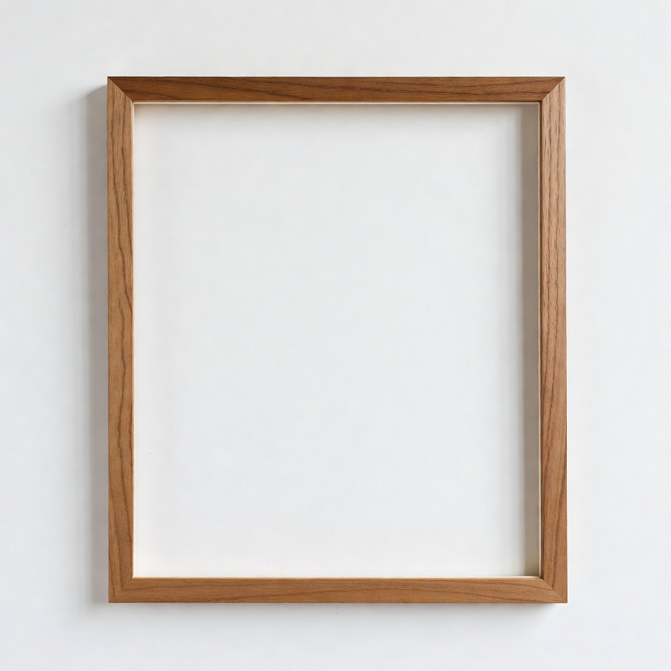 A wooden frame is displayed on a plain wall without any artwork. The frame is empty, showing off its design and color.