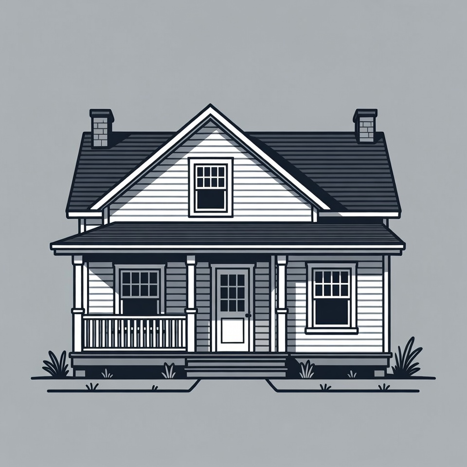 A drawing of a two-story house with a front porch. The house has windows and a door, showing a classic design.