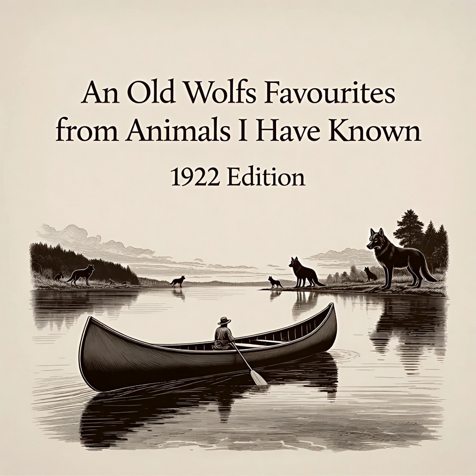 1922, animals, boating, book cover, canoe, edition, lake, landscape, man, nature, old, outdoors, peaceful, reflection, shore, trees, vintage, water, wildlife, wolves