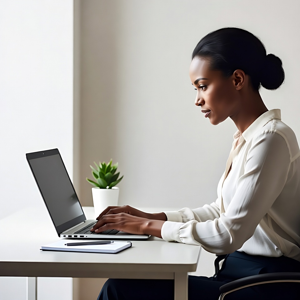 A woman sits at a desk using a laptop. She types with focus. A small plant sits nearby. Natural light comes through the window.