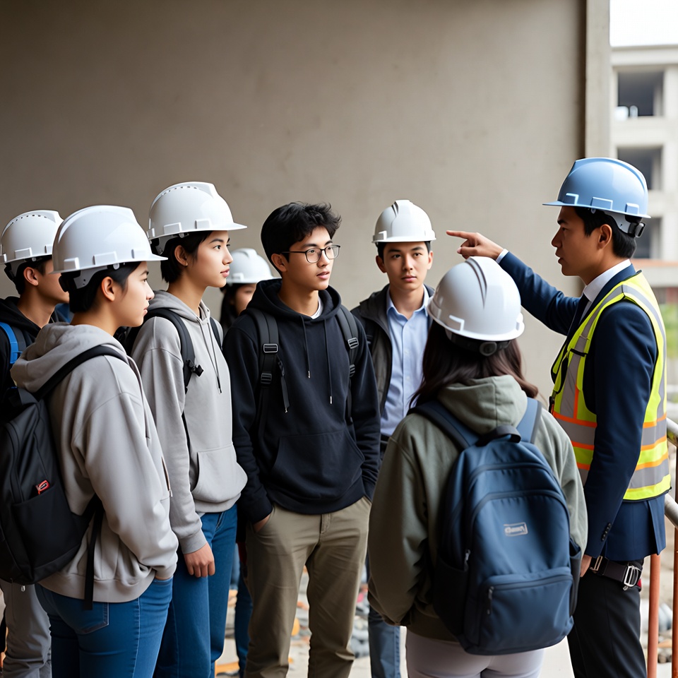 A group of students listens to a construction expert on a site. They wear safety helmets and show interest in learning about construction work.