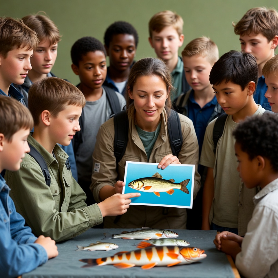 activity, aquatic life, children, classroom, education, engagement, fish, fish identification, group, habitat, interaction, learning, lesson, nature, school, science, species, teacher, visual aids, youth