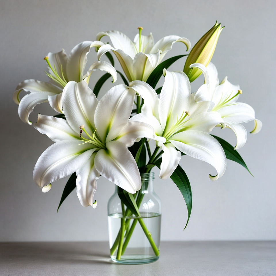 A bouquet of white lilies in a glass vase sits on a table. The flowers are fresh, with one bud still closed.