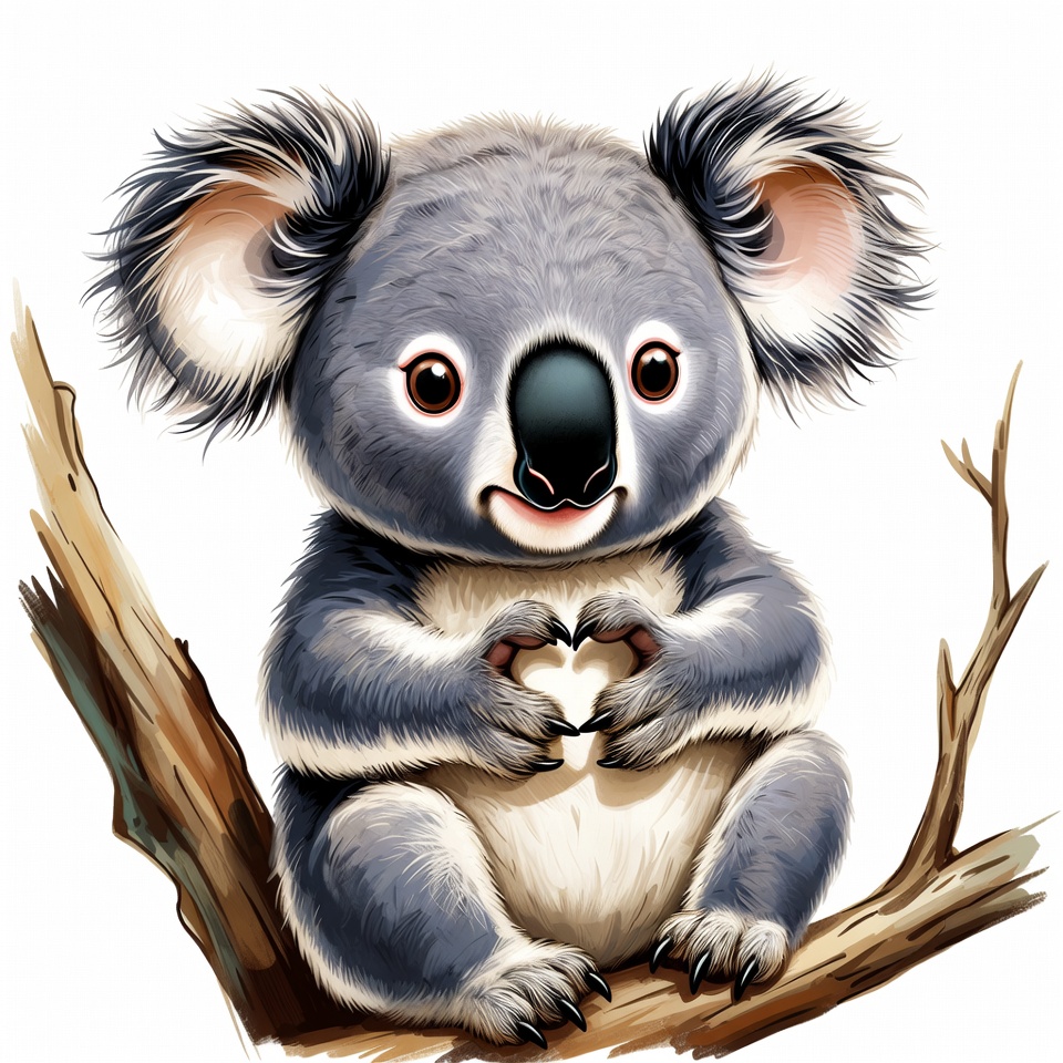 Australia, animal, art, branch, cartoon, character, cute, forest, greenery, habitat, heart, illustration, koala, marsupial, nature, paws, playful, smiling, tree, wildlife