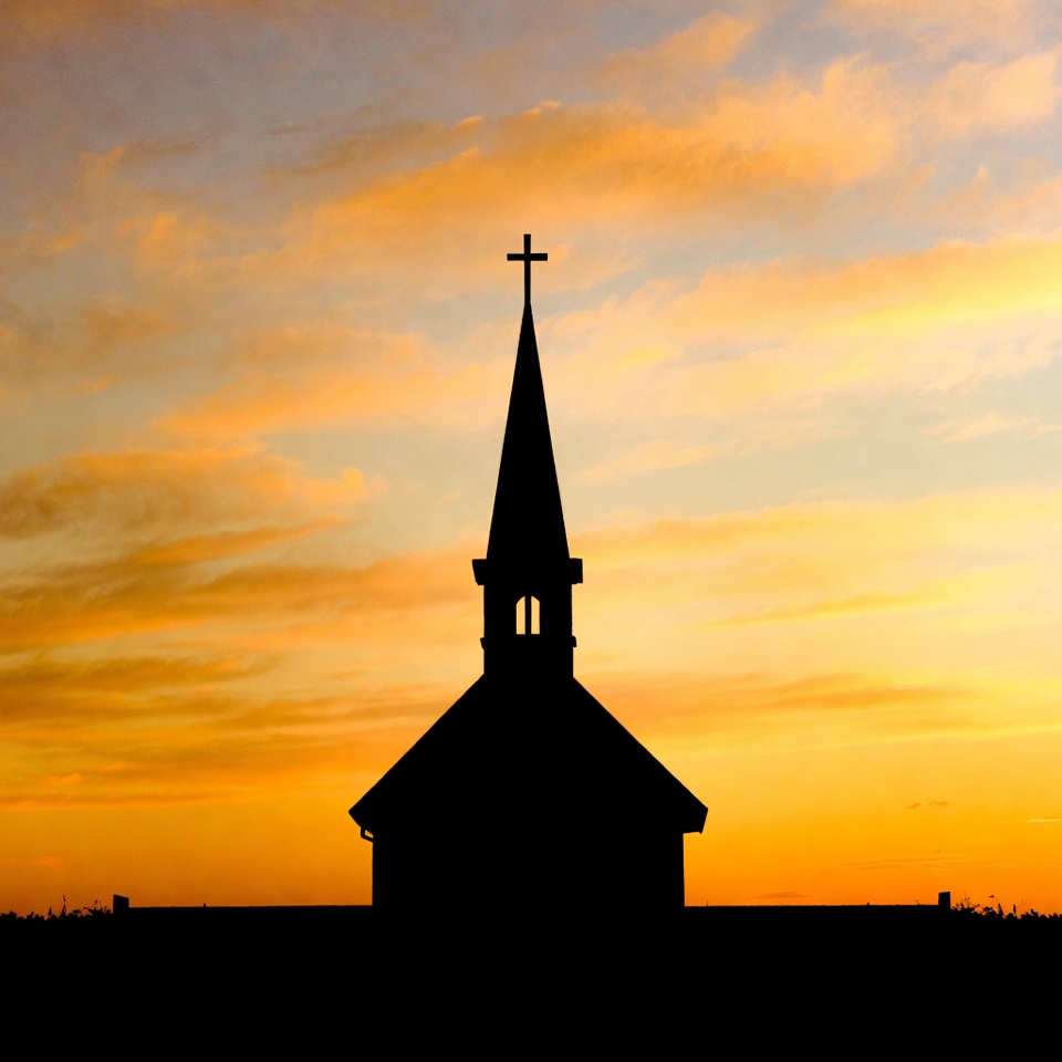 A church silhouette stands tall against a sunset sky filled with colors. The scene shows the structure with a cross at the top.