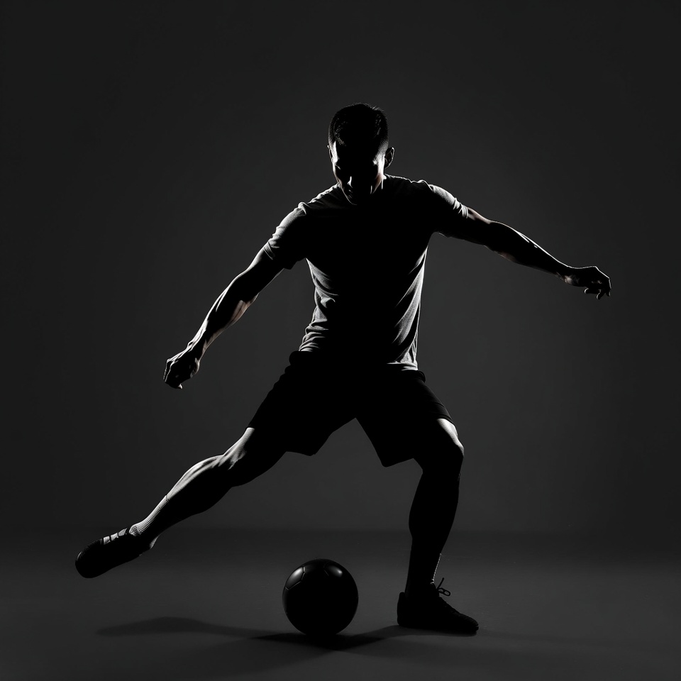 A player in a dark space controls a soccer ball with one foot while balancing on the other. A dynamic moment captured during practice.