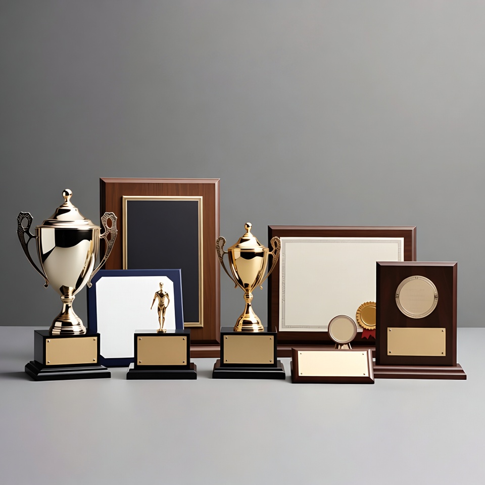 Several trophies and blank awards are arranged on a gray table. The scene highlights different shapes and sizes of recognition items.