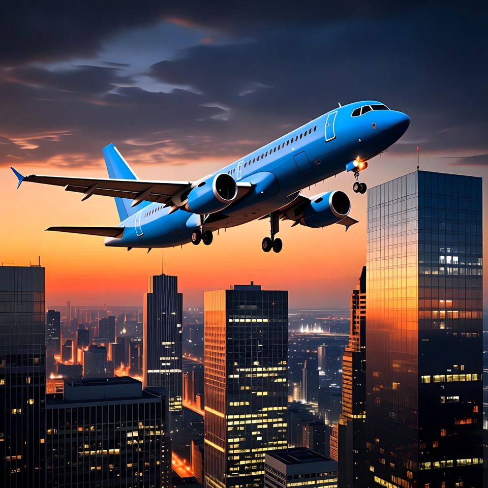 An airplane flies above tall buildings in a city during sunset. The sky shows bright colors as night approaches.