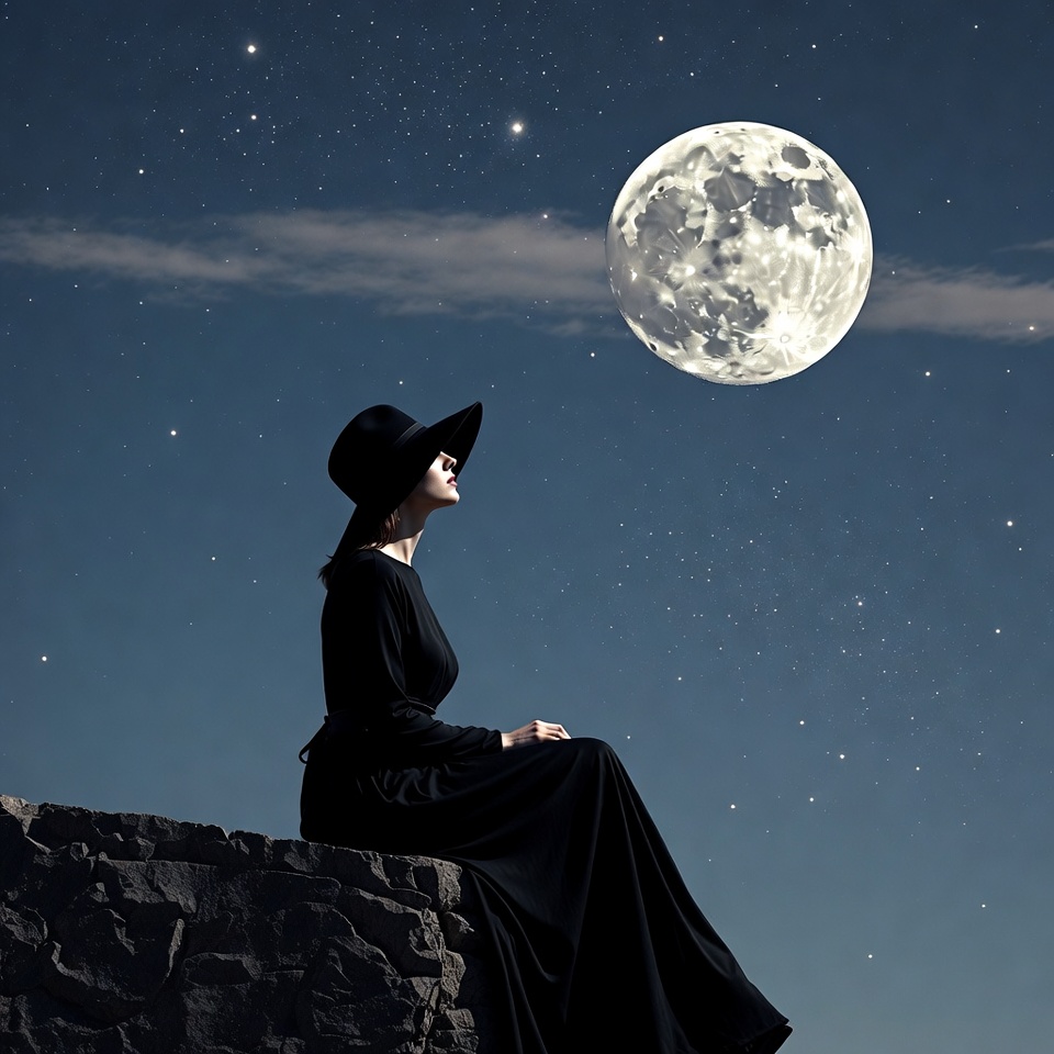 A woman sits on a stone ledge, looking up at a bright full moon in a starry night sky while wearing a black dress and hat.