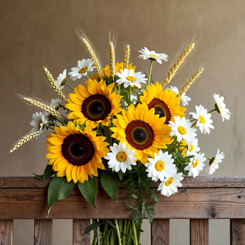 A bouquet of sunflowers and daisies rests on wooden planks. Wheat stalks add texture to the arrangement.