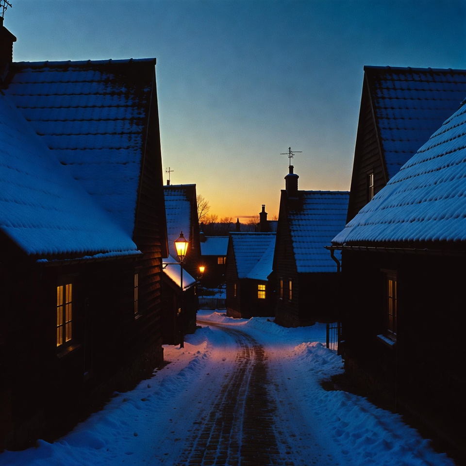 Snowy village street at dusk