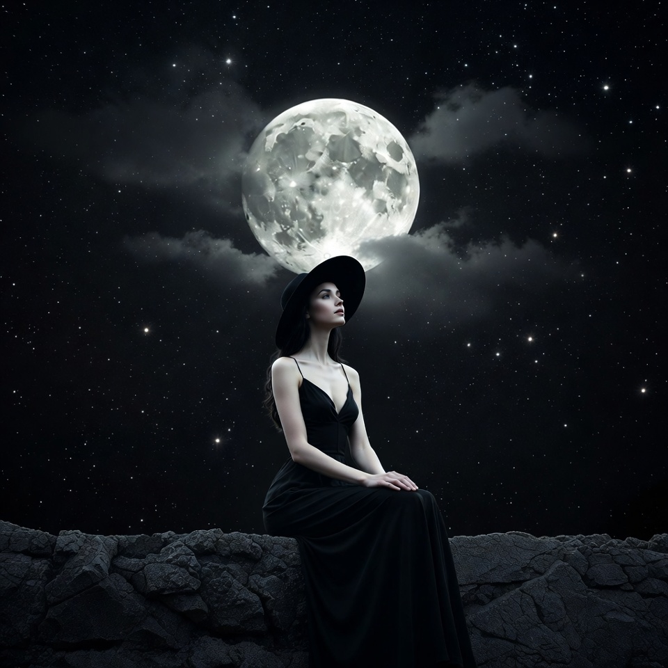 A woman in a long dress and hat sits on a rock under a bright full moon. Stars are visible in the dark night sky around her.