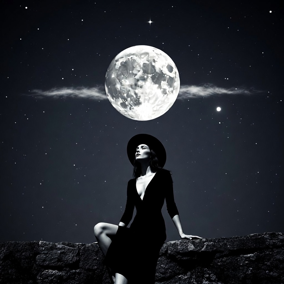 A woman sits on a stone wall at night, gazing at a large full moon in the sky. Stars surround the moon, creating a dark atmosphere.