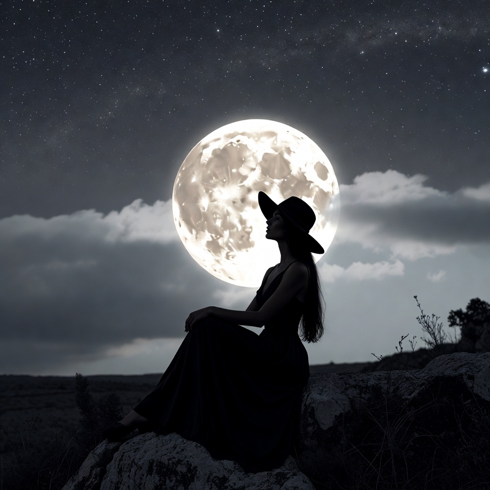 A woman wearing a hat sits on a rock at night, looking at a large full moon in a starry sky with clouds.