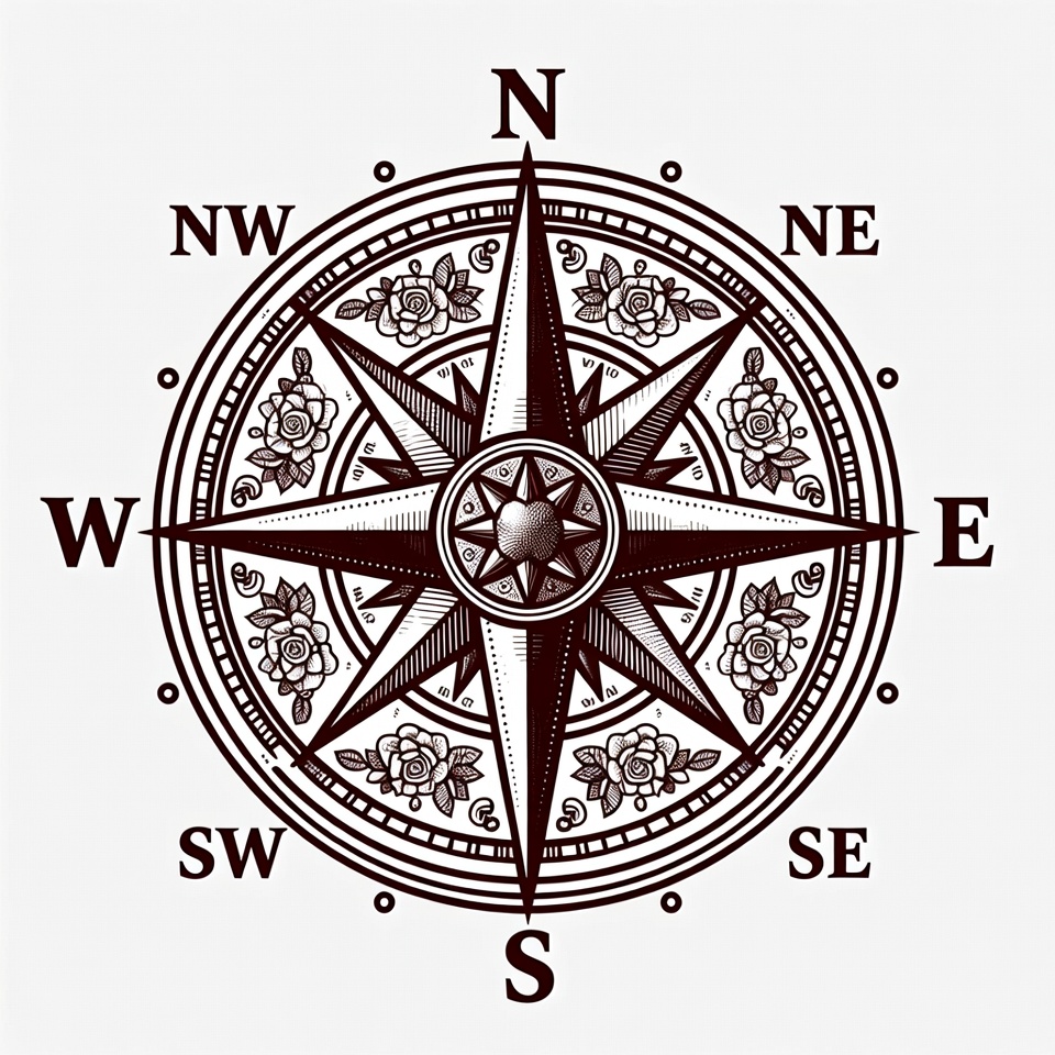 A classic compass rose with eight points and flower details around it. It displays the cardinal directions clearly.