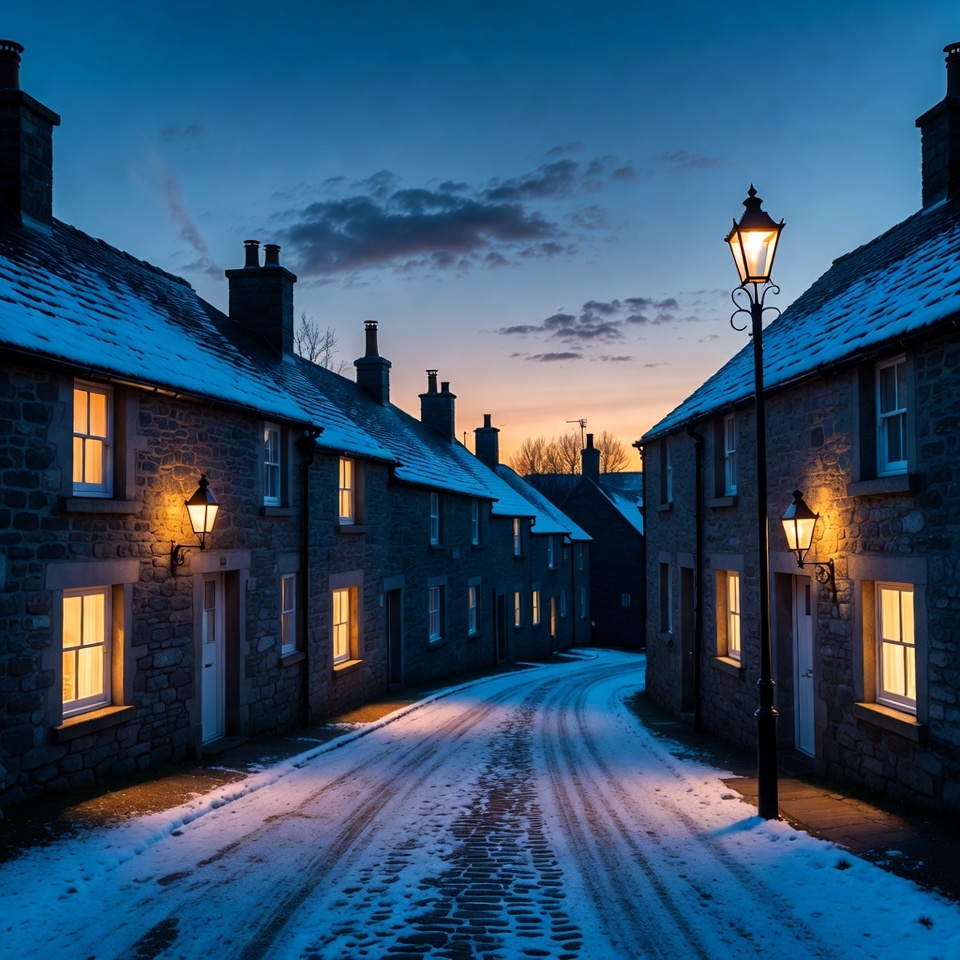 Houses in a village have glowing windows at dusk. Snow is covering the ground, and street lamps light up the road.