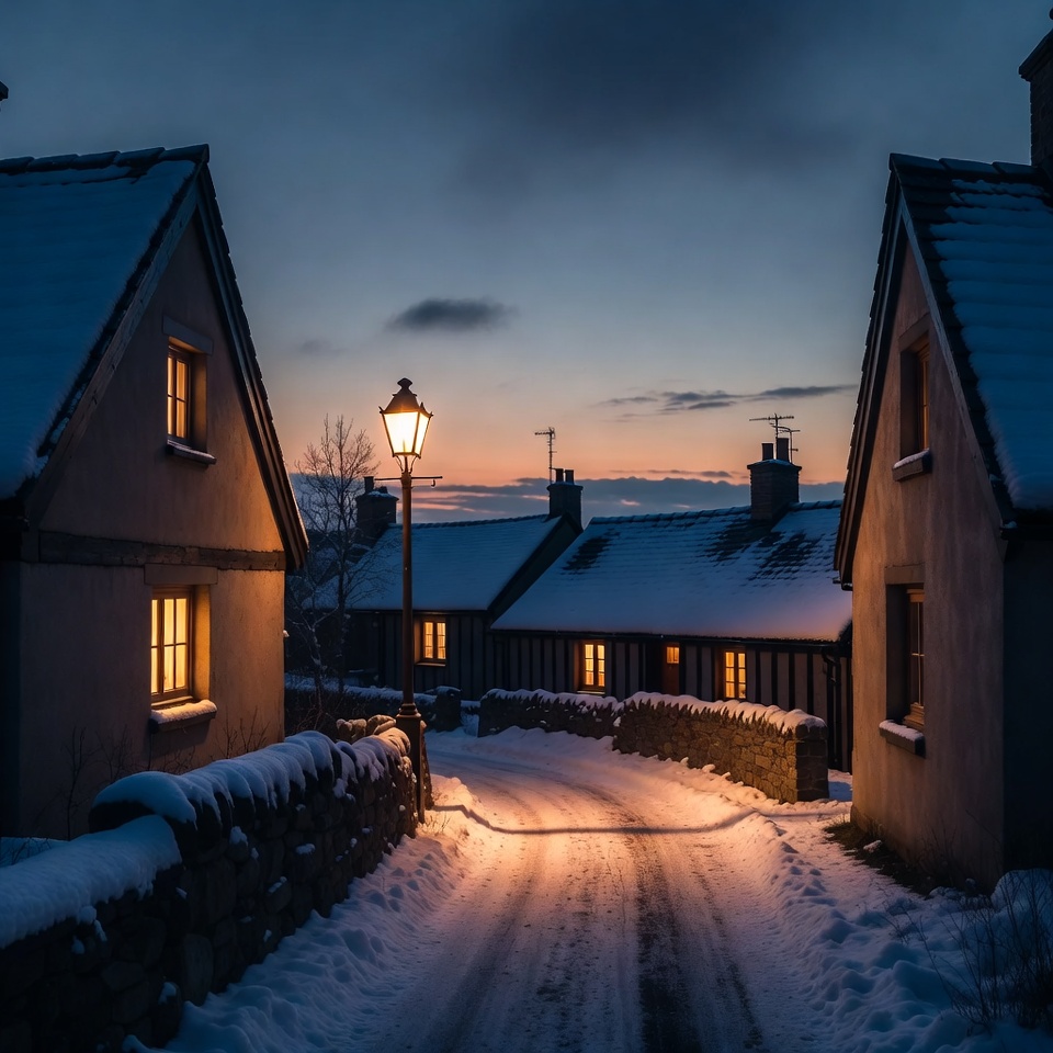 Snow covers the ground and rooftops as warm lights glow in the houses. A street lamp lights the winding path in the village at dusk.