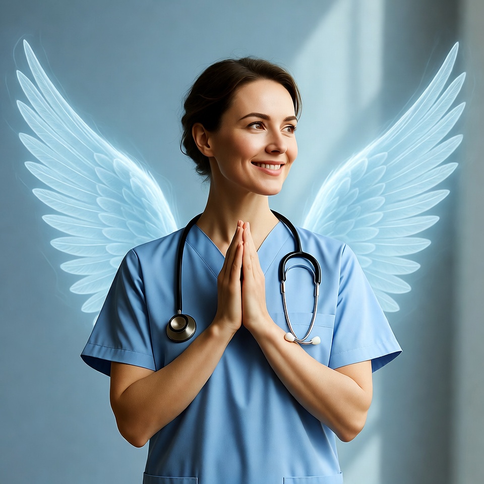 angel wings, clinic, compassion, dedication, hands, healthcare, healthcare worker, hope, hospital, medical, nurse, patient care, prayer, professional, scrubs, service, smiling, support, teamwork, wellness