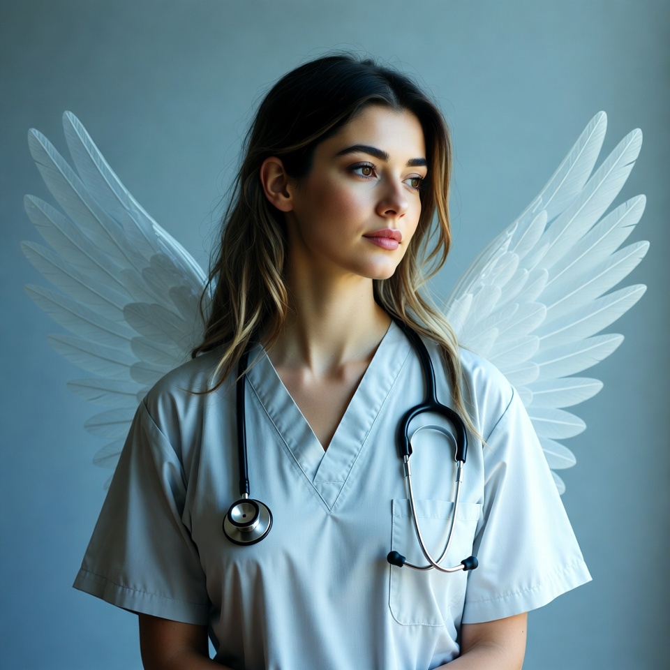 A nurse stands with wings behind her, wearing scrubs and a stethoscope. She looks serious and focused in an indoor setting.