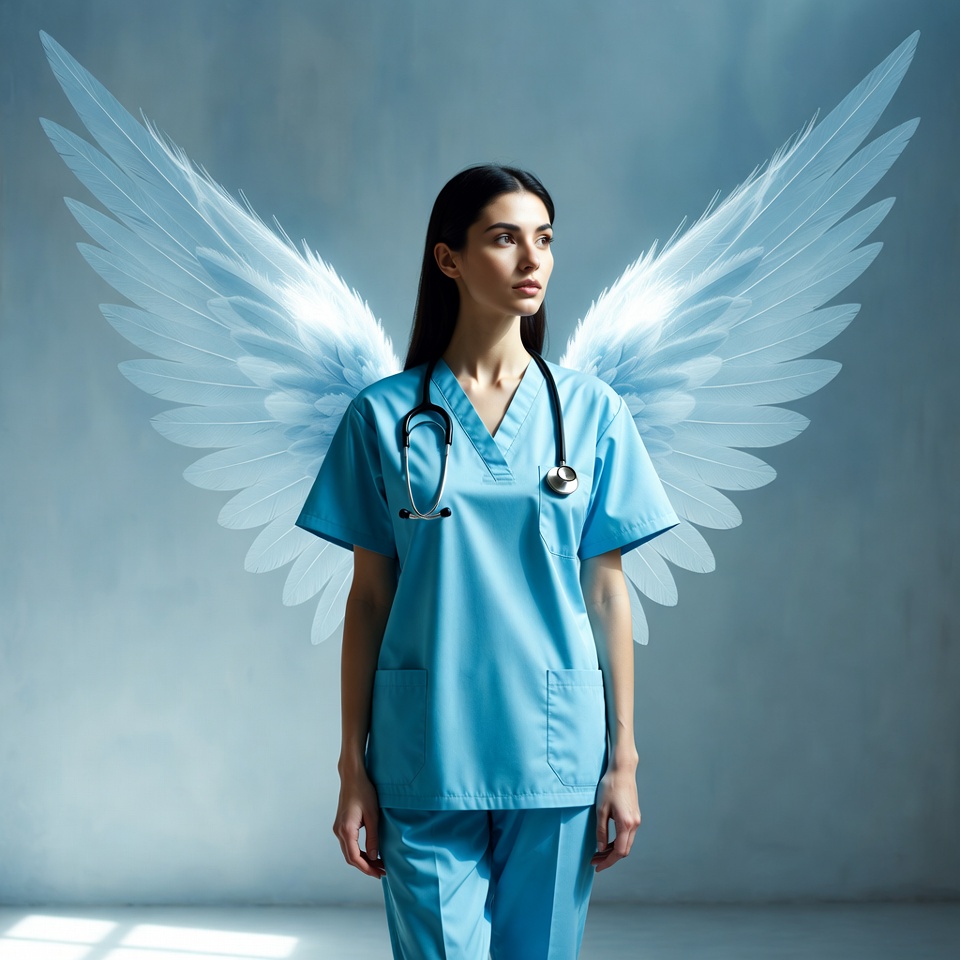 A health worker stands in a hospital room wearing blue scrubs and a stethoscope. White angel wings appear behind her in soft light.
