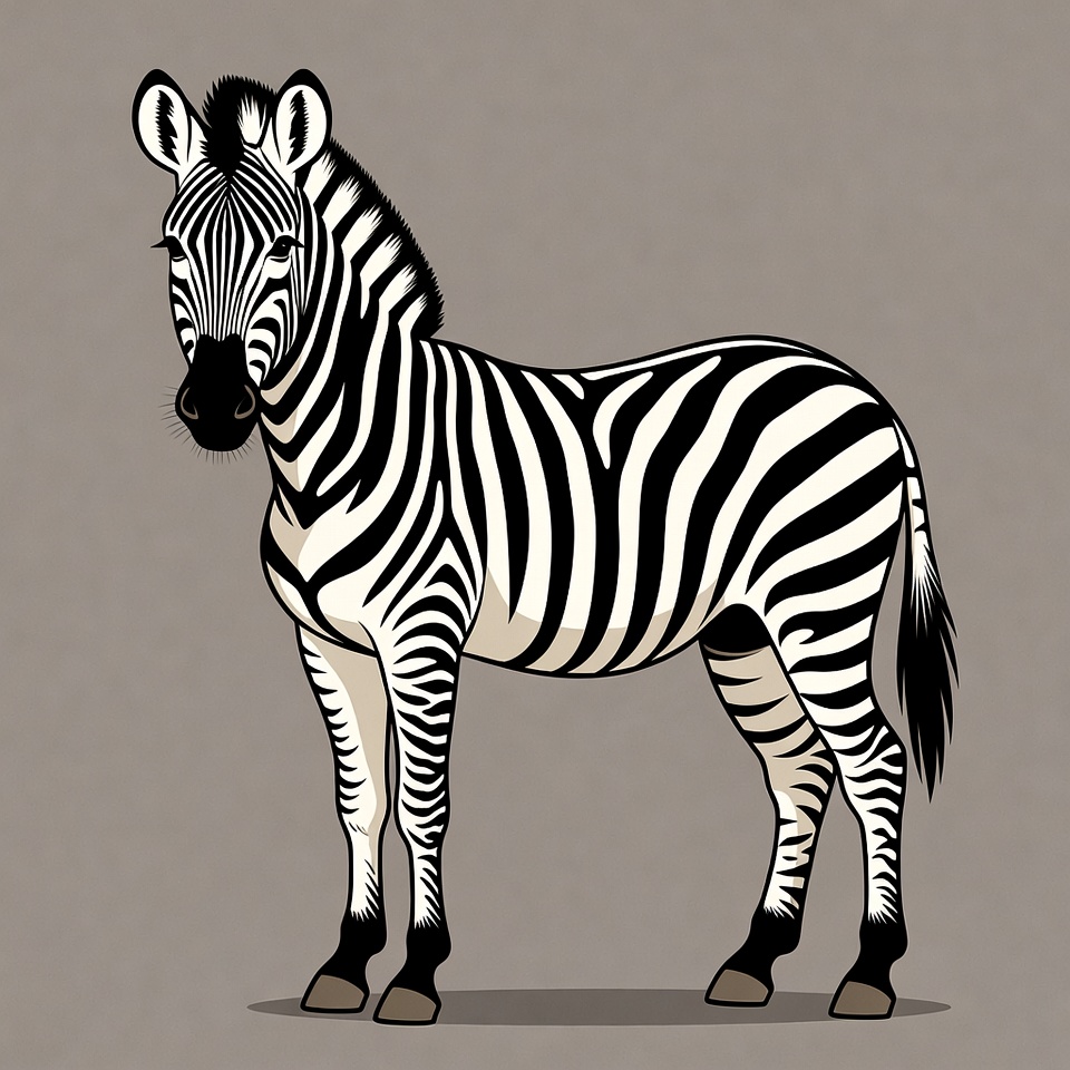 A zebra is standing still with its distinct black and white stripes. It appears calm and focused in an empty setting.