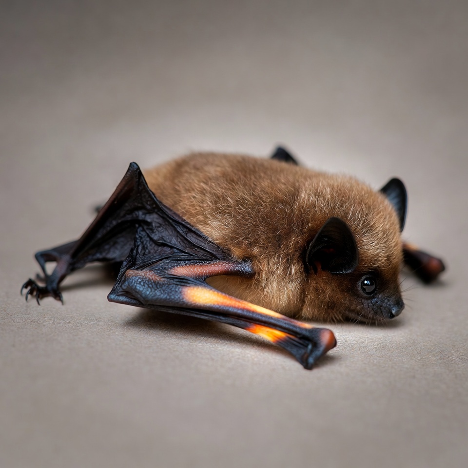 A small bat lies flat on a surface with its wings spread gently around it. The bat looks calm and seems to be resting.