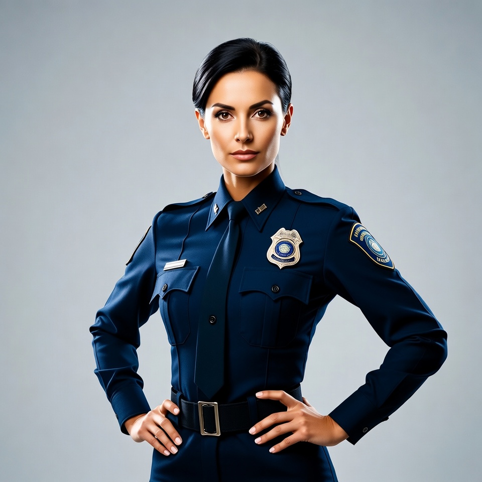 A woman stands confidently in a police uniform, hands on her hips. She is focused and serious, wearing a badge on her chest.