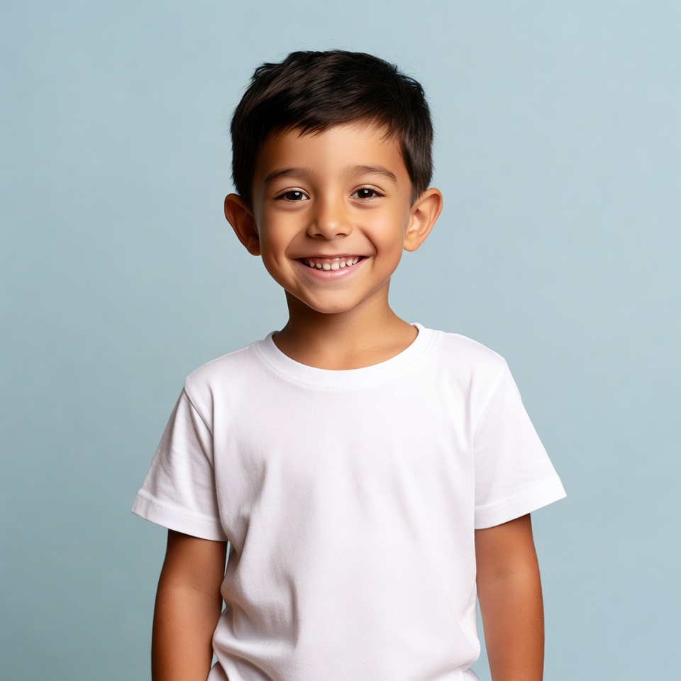 A young boy with dark hair stands in front of a blue background. He is smiling and wearing a plain white shirt.