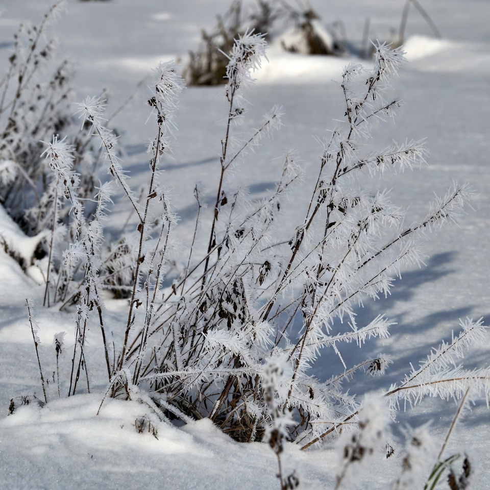Frosty plants stand out against a snowy background. The cold weather creates a white layer on the branches and ground.