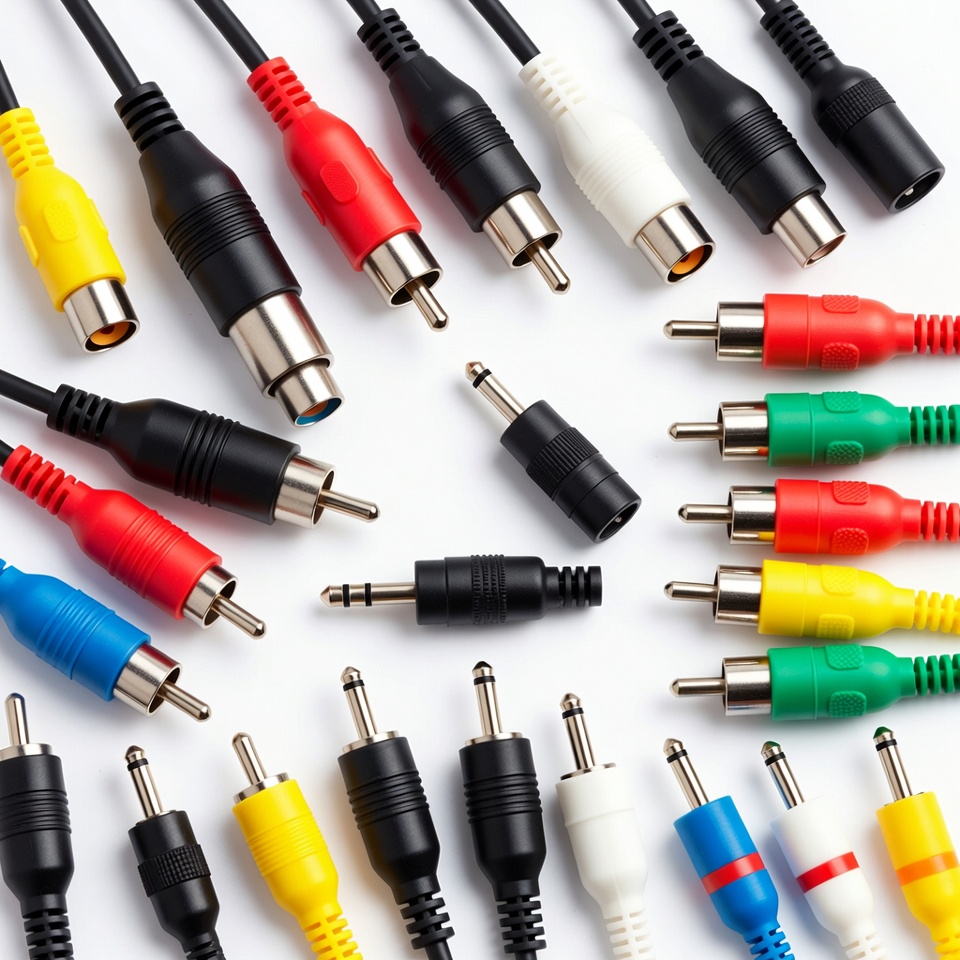 Different types of audio cables are arranged together on a surface. The cables have various colors and connectors, showing a mix of styles.