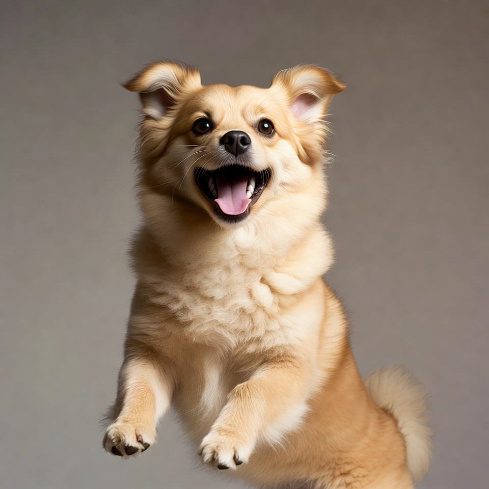 A dog with fluffy fur leaps joyfully in a studio setting. The pet shows excitement and energy while in mid-air.