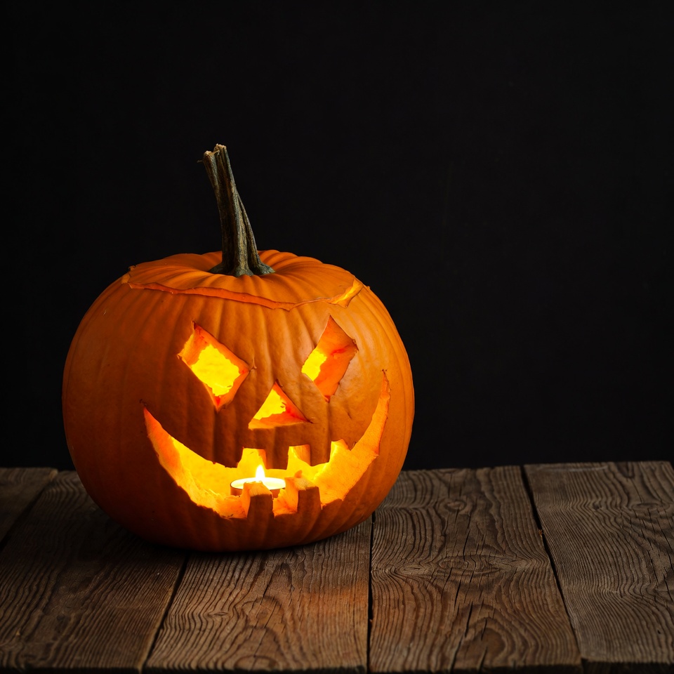 A carved pumpkin sits on a wooden table, lit from inside. It shows a smiling face and Halloween spirit. The background is dark.