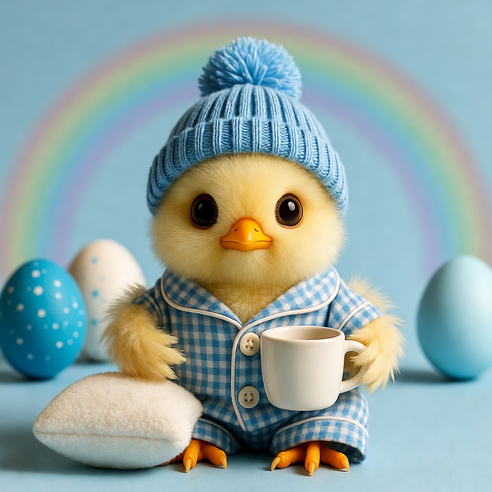 A chick in blue pajamas sits holding a cup. Colorful eggs are nearby. A rainbow is visible in the background, adding color to the scene.