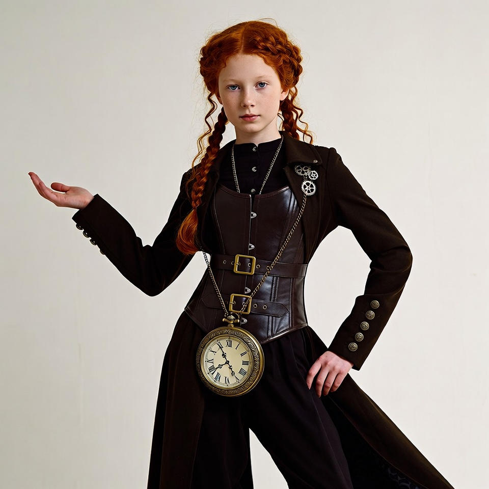 apparel, attire, confidence, corset, creative, display, expression, fashion, girl, hairstyle, modeling, outfit, pocket watch, pose, red hair, setting, studio, style, unique, youth