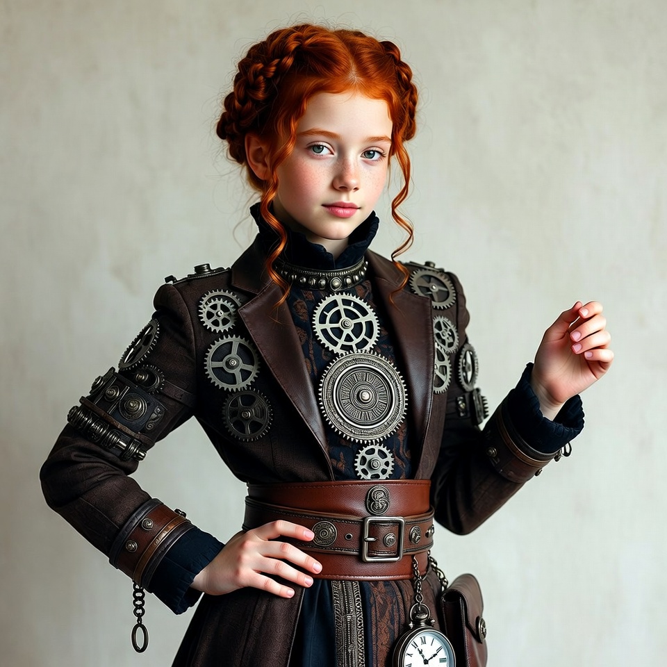 Victorian, accessories, art, clock, confident, costume, craftsmanship, creative, design, detail, fashion, gears, girl, indoor, outfit, portrait, red hair, standing, steampunk, young