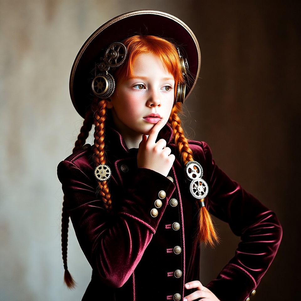 accessories, braids, character, child, clothing, creativity, expression, fashion, girl, hat, indoor, lighting, outfit, portrait, posing, setting, steampunk, style, thoughtful, vintage