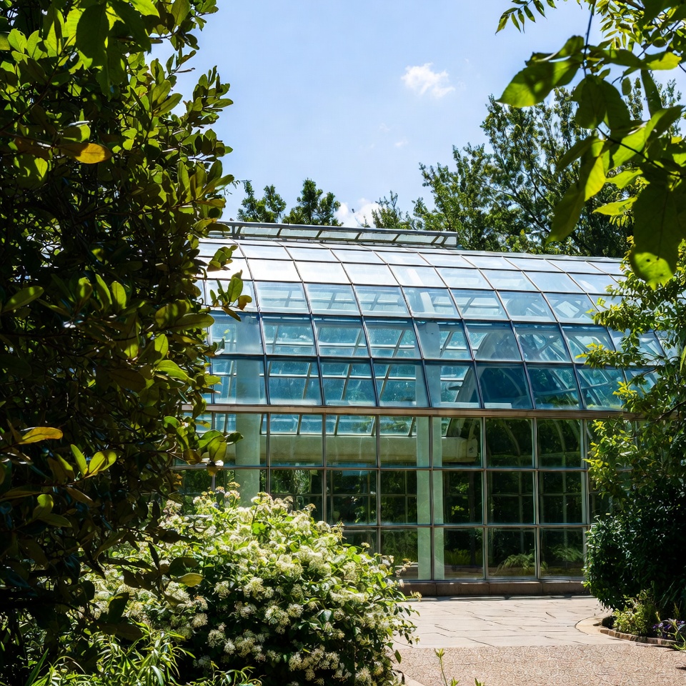 architecture, blue sky, botanical, day, environment, flowers, foliage, garden, glass, greenery, greenhouse, landscaping, nature, outdoor, park, plants, structure, sunlight, sunny, trees