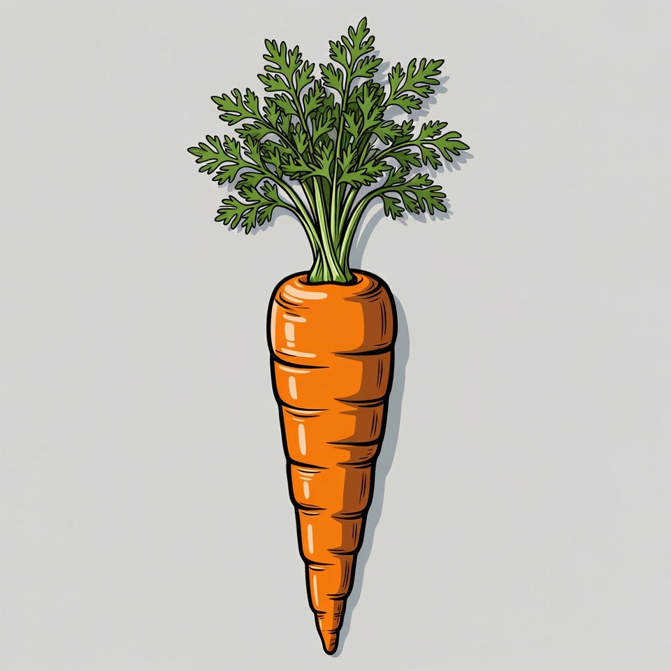 A carrot stands upright with green leaves on top. The carrot is bright orange and features a smooth surface.
