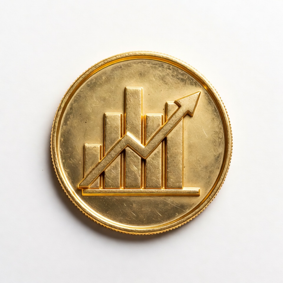 A coin displays a symbol of a growing bar graph with an upward arrow sign, representing financial growth and investment concepts.