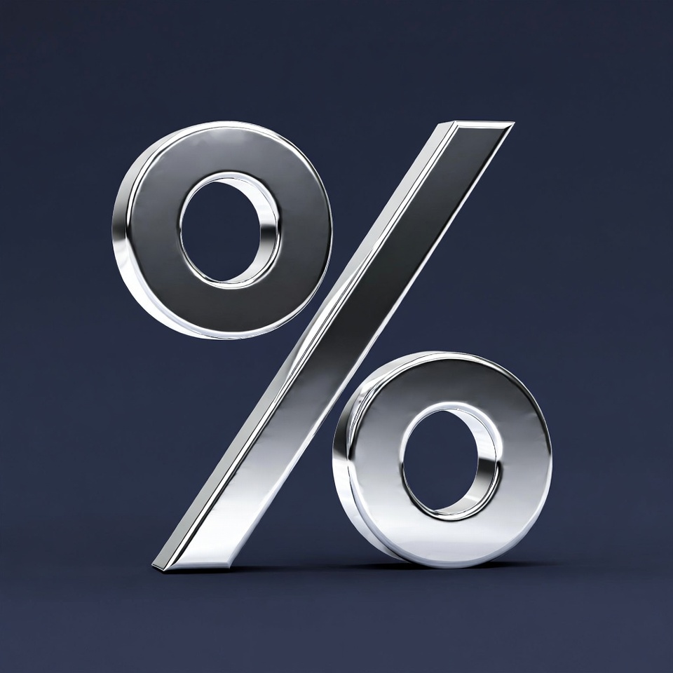 A large metallic percentage symbol stands prominently against a dark background, highlighting its shiny and reflective surface in a simple design.