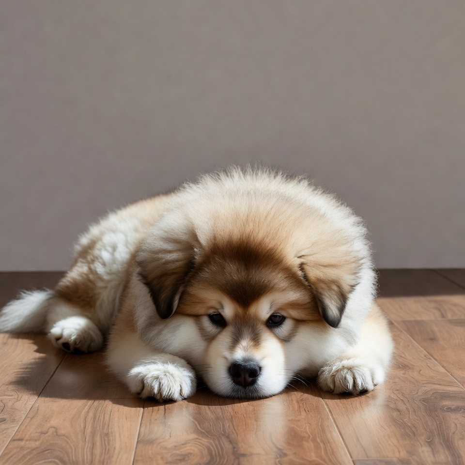 A puppy lies on a wooden floor, resting with its head down. The dog has fluffy fur and seems calm and relaxed in the space.