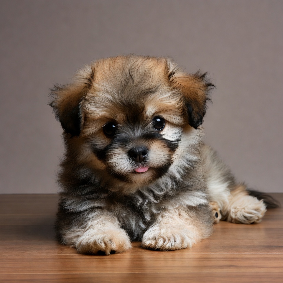 A small puppy with fluffy fur plays on a wooden table, looking curiously at its surroundings. The puppy appears happy and playful.
