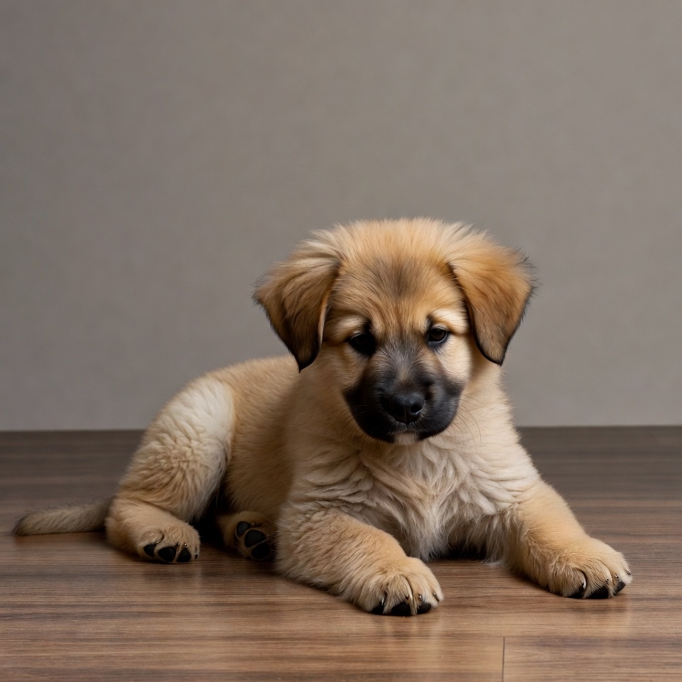 A small, fluffy puppy lies on the wooden floor. It looks playful and curious. The background is a light color, highlighting the puppy's fur.